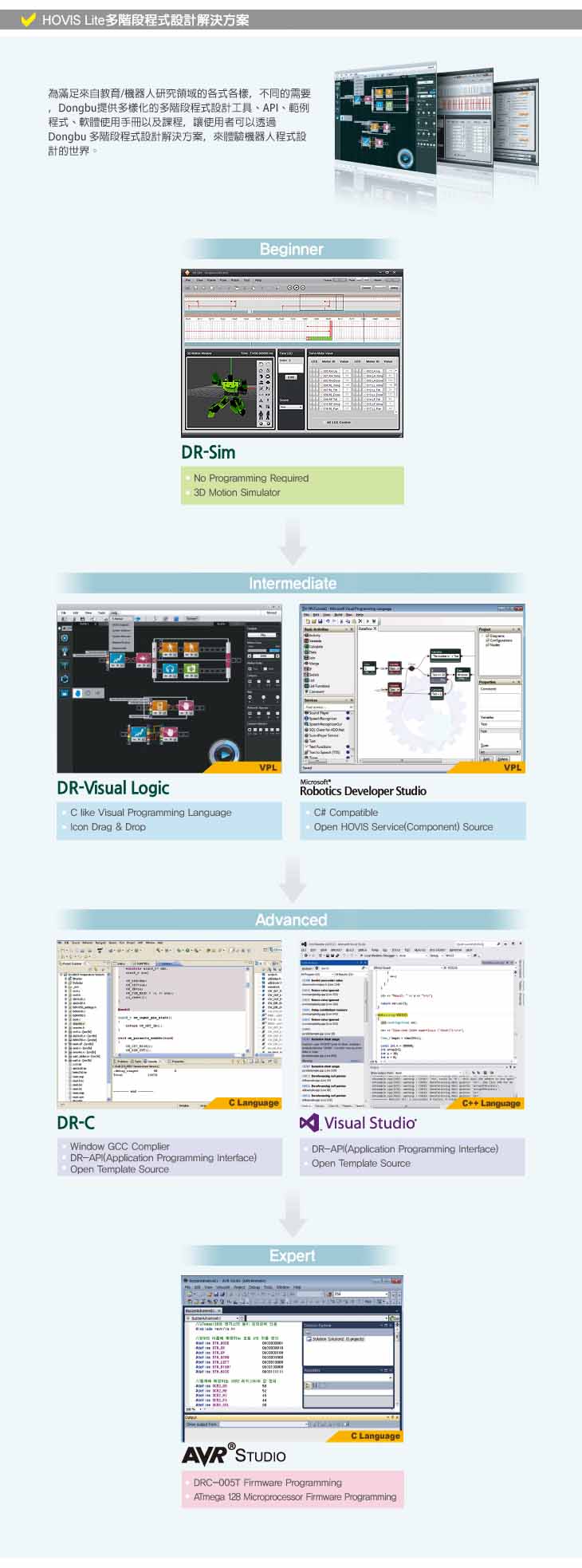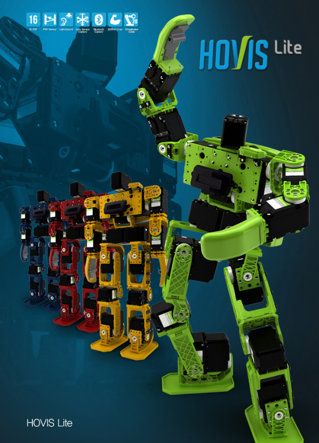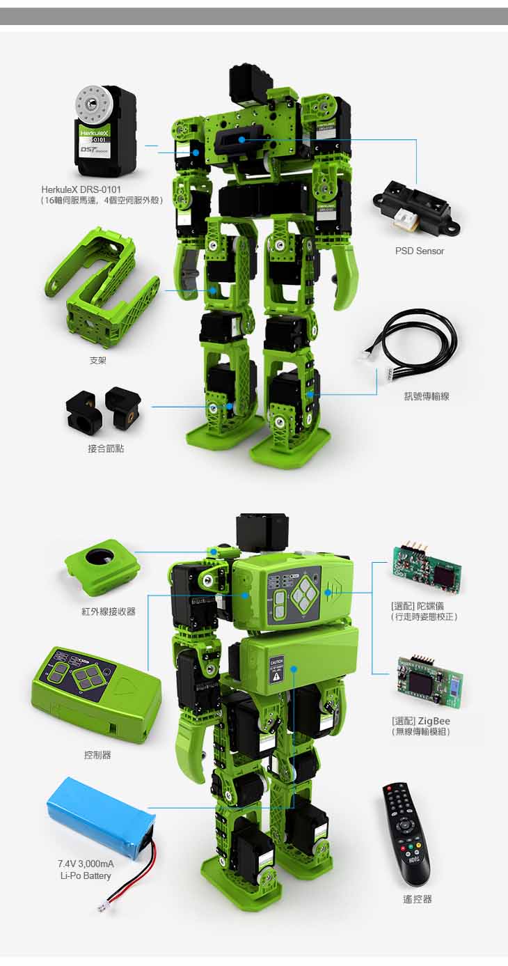 機器人具備16軸AI伺服馬達﹐搭配PSD距離感測器、聲音感測器及光感測器等基本的機器人配備﹐另可選購3軸陀螺儀及Zigbee模組。擁有各式的手冊與課程內容﹐即使是入門新手能夠很容易建構屬於自己的機器人﹐搭配原廠軟體與範例程式﹐就能輕易編輯動作及程式。